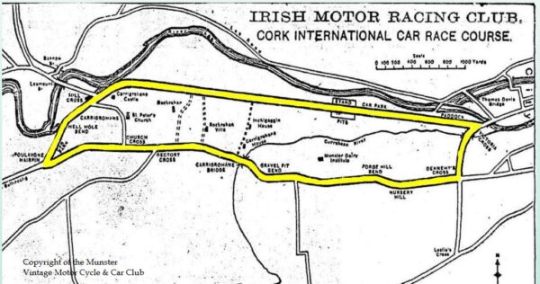 The course had its start / finish line on the Carrigrohane Straight, near where the County Hall is now situated.  From there, the six mile circuit went towards the city and turned hairpin right at Victoria Cross, up to Dennehy’s Cross and on to Model Farm Road.  Having  passed Forge Hill Bend and Gravel Pit Bend it made its way to Poulavone Hairpin, now a roundabout near Ballincollig,  before heading back, via Hell Hole Bend, onto the Carrigrohane Straight where speeds of over 150mph (240 kph) would have been reached.